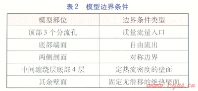 對(duì)于殼側(cè)36°物理模型,流體從頂部3個(gè)分流孔流入,從底部端面流出,兩側(cè)剖面為對(duì)稱邊界,中間纏繞層底部4列為加熱壁面,其余壁面均為固定無滑移絕熱壁面,模型邊界條件見表2,輸入的參數(shù)見表3。表3中的參數(shù)值與AUNAN的實(shí)驗(yàn)數(shù)據(jù)8[180-187]相一致。