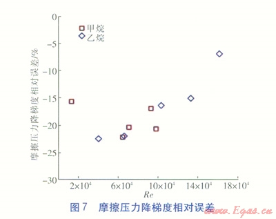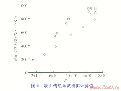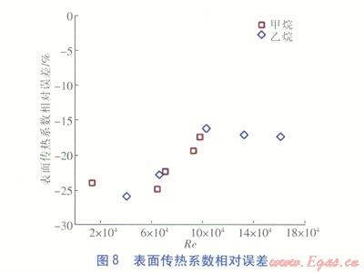 從圖5和圖6可看出,殼側(cè)制冷劑過熱態(tài)流動(dòng)時(shí)摩擦壓力降梯度、表面?zhèn)鳠嵯禂?shù)均與雷諾數(shù)呈同向變化,摩擦壓力降梯度變化范圍較大,表面?zhèn)鳠嵯禂?shù)基本在200~1000W/(m2·K)。從圖7和圖8可看出,無論是甲烷還是乙烷,摩擦壓力降梯度相對(duì)誤差和表面?zhèn)鳠嵯禂?shù)相對(duì)誤差基本都控制在-25%~-15%范圍內(nèi),并且表面?zhèn)鳠嵯禂?shù)相對(duì)誤差隨著雷諾數(shù)增大而變小。由于殼側(cè)模型幾何形狀復(fù)雜,流道間隙細(xì)小,所以在不修正湍流模型的情況下數(shù)值計(jì)算相對(duì)誤差尚可。