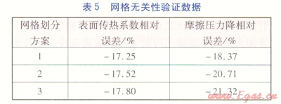 為了考察網(wǎng)格疏密程度對(duì)數(shù)值求解的影響以及確定網(wǎng)格劃分方案,本文以AUNAN的一組甲烷過熱氣實(shí)驗(yàn)數(shù)據(jù)[8]165作為依據(jù),采用動(dòng)態(tài)模擬進(jìn)行計(jì)算,壁面函數(shù)為增強(qiáng)壁面函數(shù),網(wǎng)格無關(guān)性驗(yàn)證數(shù)據(jù)見表5。