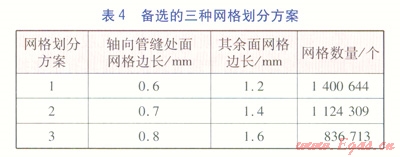 使用ANSYS ICEM CFD軟件對(duì)物理模型進(jìn)行網(wǎng)格劃分,采用非結(jié)構(gòu)化網(wǎng)格,先對(duì)面生成網(wǎng)格,進(jìn)而自適應(yīng)生成體網(wǎng)格。在整個(gè)模型中,纏繞管的軸向管縫寬1.94mm,為最小的幾何尺度,故以此作為面網(wǎng)格的劃分依據(jù),備選的三種網(wǎng)格劃分方案見表4。另外,為了精確計(jì)算摩擦壓力降和表面?zhèn)鳠嵯禂?shù),特在三層纏繞管的壁面處設(shè)置較細(xì)的邊界層,邊界層起步厚度為0.005mm,增長因子為1.2,共計(jì)10層邊界層。