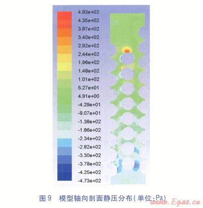 以甲烷在Re=7×104下(對(duì)應(yīng)的質(zhì)量流量為0.0185kg/s)的流動(dòng)、換熱為例,圖9~11分別是模型軸向通過中間分流孔中心的剖面(以下簡稱軸向剖面)靜壓、速度、溫度分布圖,圖12是加熱管周圍速度分布局部放大圖,圖13是加熱管壁面溫度分布圖,圖14是沿模型高度方向跨度取0.5倍軸向間距(6.97mm)時(shí)的流道靜壓變化圖。