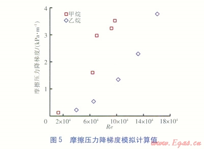 根據(jù)已建立的物理模型,使用ANSYS FLUENT軟件分別對(duì)AUNAN的甲烷、乙烷過熱氣流動(dòng)實(shí)驗(yàn)數(shù)據(jù)(見表3)進(jìn)行了數(shù)值模擬,模擬具體設(shè)置見表6。在來流進(jìn)入殼側(cè)流道之后,以圖4中的流道截面1和2作為計(jì)算數(shù)據(jù)獲取位置,摩擦壓力降梯度與表面?zhèn)鳠嵯禂?shù)(本文中的表面?zhèn)鳠嵯禂?shù)均指4個(gè)加熱壁面處的平均表面?zhèn)鳠嵯禂?shù))模擬計(jì)算值見圖5和圖6,模擬計(jì)算值與實(shí)驗(yàn)值之間的相對(duì)誤差見圖7和圖8。在圖5~8中,雷諾數(shù)(Re)和摩擦壓力降梯度(Dp)的定義分別如下: