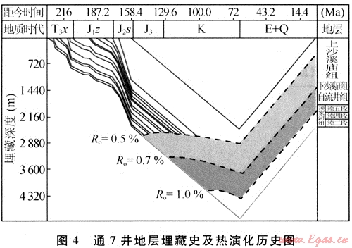 從圖4中可以看出中侏羅世末期,須家河組底部地層的鏡質(zhì)體反射率低,大都在0.4%~0.5%;晚侏羅世末期,達到成熟階段,鏡質(zhì)體反射率大于0.7%,已進入生烴門限,開始大量生烴;白堊紀(jì)沉積時期,由于四川盆地中部的繼續(xù)抬升,西部坳陷區(qū)繼續(xù)下沉,使白堊系-第三系的沉積厚度在盆地坳陷區(qū)和中部隆起區(qū)形成較大的差異,在研究區(qū)雖然這一時期沉積厚度較薄,由于漫長時間對溫度的補償作用,鏡質(zhì)體反射率Ro也增高,進入成熟階段,白堊紀(jì)-第三紀(jì)進入成烴高峰期,現(xiàn)今仍然處于成烴高峰期(圖4)。因此,白堊系及以后的沉積階段是研究區(qū)須家河組油氣大量生成的時期。