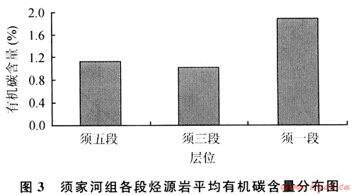 在分析的80個樣品中,有機碳含量的變化范圍為0.51%~7.12%,平均為1.47%。其中須一段有機碳含量為j.51%~7.12%,平均值1.87%;須三段為0.53%~1.80%,平均值1.02%;須五段為0.54%~2.48%,平均值1.12%(圖3)??梢钥闯鲰毤液咏M各層段烴源巖的平均有機碳含量都在生烴門限值以上,根據(jù)上述烴源巖有機碳豐度評價標(biāo)準(zhǔn),結(jié)合所分析的樣品來看,川中-川南過渡帶上三疊統(tǒng)須家河組烴源巖總體上屬于較好-中等烴源巖,具有一定的生烴物質(zhì)條件基礎(chǔ)。
