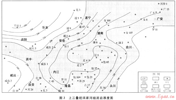 在川西金堂-彭縣-新津一帶,暗色泥巖厚度大(1000~1240m),最厚可逾1500m(隆豐1井),并央有煤層。往盆地的東南側(cè)為濱湖淺湖沼澤相區(qū),暗色泥巖減至100~300m,但煤層相對較發(fā)育。在川中地區(qū),煤層一般厚3m以上,具多層分布的特點,層數(shù)多者可達數(shù)十層,單層厚度大者為1m左右,累計厚度超過25m。再往東南側(cè)則為三角洲平原-泛濫平原相區(qū),由于沉積相帶的變化,沉積物變粗,泥質(zhì)巖厚度明顯減薄,而且成煤條件也相對較差,所見煤層一般都很薄,總厚較小,多小于2.5m,局部僅以煤線形式出現(xiàn),且橫向上分布不穩(wěn)定。由于沉積相帶的變化和沉積中心的遷移,上三疊統(tǒng)須家河組從盆地的西北到東南層段也在發(fā)生變化。研究區(qū)內(nèi)上三疊統(tǒng)須家河組泥巖厚度變化很大,從100~300m,最大厚度在平泉1井,總的變化趨勢是從西北到東南,厚度逐漸減小(圖2),但各層厚度相差較大,分布范圍也不一致。
