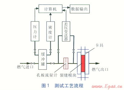 測(cè)試實(shí)驗(yàn)前,對(duì)測(cè)試實(shí)驗(yàn)整個(gè)系統(tǒng)進(jìn)行吹掃置換,使系統(tǒng)符合燃?xì)膺\(yùn)行條件。將低壓燃?xì)庖?span lang="EN-US">2m3緩沖罐中,燃?xì)膺M(jìn)入此緩沖罐靜置一段時(shí)間后,其溫度、壓力及密度處于相對(duì)穩(wěn)定狀態(tài)。測(cè)試開(kāi)始后,由緩沖罐所連接的壓力計(jì)與密度計(jì)測(cè)量燃?xì)鈮毫εc密度,并將測(cè)量數(shù)據(jù)連續(xù)傳輸給計(jì)算機(jī)。計(jì)算機(jī)接收數(shù)據(jù)信號(hào)后,計(jì)算出未修正前的燃?xì)饬鹘?jīng)裂縫模塊的理論流量q0。同時(shí)燃?xì)饨?jīng)孔板流量計(jì)、卡具內(nèi)裂縫模塊流至室外大氣中。在此期間,孔板流量計(jì)兩側(cè)由燃?xì)鈱?dǎo)壓管相連接的差壓變送器同時(shí)獲取燃?xì)獠顗簲?shù)據(jù)信號(hào),并傳輸給計(jì)算機(jī),由計(jì)算機(jī)編程計(jì)算出此刻流經(jīng)裂縫模塊的燃?xì)庑孤?shí)際流量q0。最后計(jì)算機(jī)計(jì)算輸出燃?xì)饬髁啃拚禂?shù)K(K=qv/q0),完成整個(gè)測(cè)試實(shí)驗(yàn)。