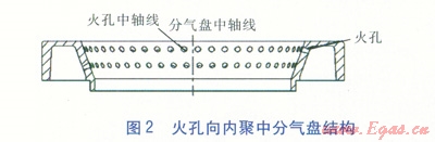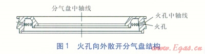 改變?cè)瓉淼幕鹂紫蛲馍㈤_分氣盤結(jié)構(gòu),將分氣盤設(shè)計(jì)成火孔向內(nèi)聚中分氣盤,即火孔分布在分氣盤內(nèi)側(cè)邊緣。在火孔排布時(shí),分氣盤應(yīng)采用上下兩排火孔,兩排火孔的中軸線均與分氣盤的中軸線錯(cuò)開,且火孔中軸線與水平面成一定角度,這樣的火孔稱為旋火火孔。旋火火孔產(chǎn)生的火焰圍繞分氣盤的中軸線呈盤繞狀,比直火火孔(火孔的中軸線與分氣盤的中軸線相交)更能產(chǎn)生渦流形成負(fù)壓,卷入更多的二次空氣,加速燃?xì)馀c二次空氣的再混合,并推動(dòng)高溫?zé)煔饴菪仙?,燃燒更聚中、充分,增?qiáng)了高溫?zé)煔馀c鍋底的熱交換,減少了熱損失,從而提高了熱效率?;鹂紫蛲馍㈤_分氣盤結(jié)構(gòu)見圖1,火孔向內(nèi)聚中分氣盤結(jié)構(gòu)見圖2。