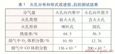 將傳統(tǒng)燃?xì)庠畎凑丈鲜龇椒ㄟM(jìn)行火孔分布和形式的改進(jìn),在鍋支架高度均為30mm、排煙間隙為30mm,未加裝半封閉燃燒室的情況下進(jìn)行測(cè)試,改進(jìn)前、后的測(cè)試結(jié)果見表1。在表1~4中,CO體積分?jǐn)?shù)是指標(biāo)準(zhǔn)狀態(tài)下、過??諝庀禂?shù)為1時(shí)的折算值。