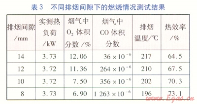 通過測(cè)試可知,排煙間隙小于10mm時(shí),由于排煙阻力增大,不利于一次空氣與二次空氣的供給,造成燃燒不完全,CO排放超標(biāo)。而排煙間隙為10mm時(shí),熱效率可達(dá)70%以上,CO排放量也在標(biāo)準(zhǔn)要求的范圍之內(nèi)。因此排煙間隙為10mm最為理想。
