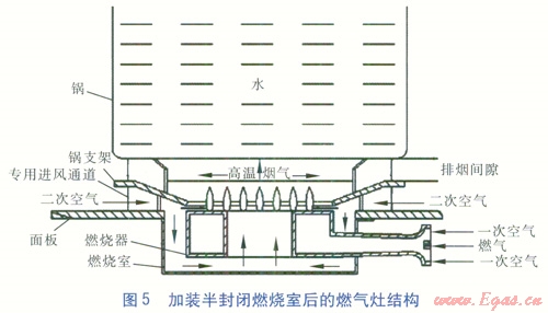 因此燃燒器應(yīng)當(dāng)放置在半封閉的燃燒室內(nèi),通過設(shè)計(jì)專用空氣通道供給燃燒所需空氣,實(shí)現(xiàn)空氣與煙氣分離,使燃燒系統(tǒng)達(dá)到一個(gè)穩(wěn)定的燃燒狀態(tài),減少煙氣帶走的熱量損失,從而提高燃?xì)庠畹臒嵝省?span lang="EN-US">