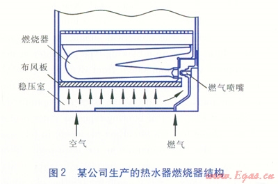 由風(fēng)機(jī)送入的空氣需要通過(guò)穩(wěn)壓室、布風(fēng)板進(jìn)行均勻布風(fēng),以保證燃?xì)庖豢諝饣旌衔镌诨鹋派险H紵?。燃燒器?nèi)空氣與燃?xì)獾木鶆蚧旌?,能夠避免燃?xì)馊紵煌耆?,繼而產(chǎn)生有毒有害物質(zhì)的現(xiàn)象,從而提高熱水器安全性能。