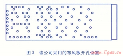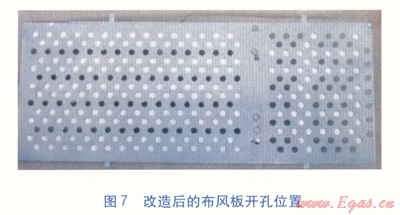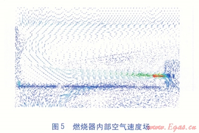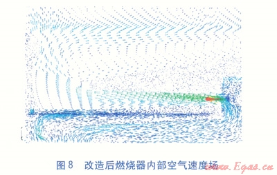 我們采取的優(yōu)化方案是在穩(wěn)壓室內(nèi)增設(shè)一個(gè)擋板,并對(duì)布風(fēng)板的開(kāi)孔進(jìn)行重新布置。改造后的穩(wěn)壓室結(jié)構(gòu)及布風(fēng)板開(kāi)孔位置分別見(jiàn)圖6、7。改造后,通過(guò)調(diào)節(jié)擋板位置可以獲得合理的一二次空氣量比例,保證一次空氣量能夠穩(wěn)定且不受燃燒過(guò)程的影響。二次風(fēng)由于處于一個(gè)楔形通道內(nèi),使得流動(dòng)更容易均勻,消除穩(wěn)壓室內(nèi)的渦旋氣流的產(chǎn)生。改造后燃燒器內(nèi)部空氣速度場(chǎng)見(jiàn)圖8。