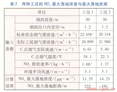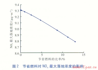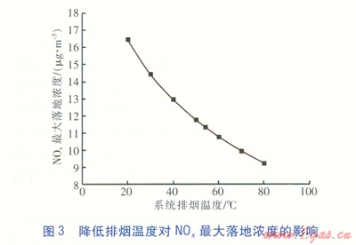 綜合分析正負(fù)兩方面因素,排煙溫度降低對(duì)NOx最大落地濃度的影響要比燃料的節(jié)省對(duì)NOx最大落地濃度的影響更為顯著,說(shuō)明排煙溫度降低是主要影響因素,綜合起來(lái)NOx最大落地濃度是隨著煙氣溫度的降低逐漸增大的。