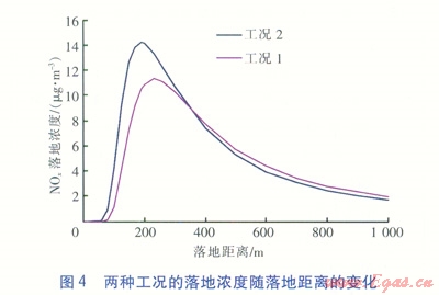 表2中木表示折算值,是將工況1排放量折算到與工況2相同供熱量條件下的數(shù)據(jù)。標(biāo)準(zhǔn)狀態(tài)是指101325Pa、0℃,工況1煙氣排放量對(duì)應(yīng)狀態(tài)為101360Pa、54.1℃,工況2煙氣排放量對(duì)應(yīng)狀態(tài)為101310Pa、22.3℃。NOx最大落地濃度和最大落地距離見(jiàn)表2。落地濃度隨落地距離(落地處與煙囪的距離)的變化見(jiàn)圖4。
