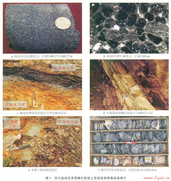該期抬升運動發(fā)生于燈影組下亞段沉積后,上揚子地臺發(fā)生整體強(qiáng)烈抬升,具有兩個方面的響應(yīng)特征:①抬升運動使燈影組下亞段微生物白云巖露出水面遭受大氣淡水溶蝕而發(fā)育溶蝕孔洞、滲流豆、鈣結(jié)殼、古風(fēng)化殘積礫屑云巖、巖溶角礫巖等。滲流豆石層的頂面是一個比較截然的界面,或者說是一個暴露面或間斷面,滲流豆的出現(xiàn)反映其形成時處于陸上暴露的環(huán)境[18]。高科l井在井深5409~5410m發(fā)育明顯的滲流豆(圖1-a、1-b)。②燈影組下亞段抬升風(fēng)化剝蝕后,地殼發(fā)生強(qiáng)烈伸展作用[19],上揚子地臺重新開始接受海侵沉積,沉積物主要為藍(lán)灰色泥巖、黑色頁巖、紫紅色泥巖、砂巖、泥質(zhì)云巖與硅質(zhì)巖,厚數(shù)十厘米至數(shù)十米不等。該“碎屑巖層”與燈影組下亞段呈平行不整合接觸,接觸面凹凸不平(圖1-c、l-f)。