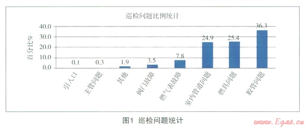 北京市燃?xì)饧瘓F從2007年5月開始進行第一期全面巡檢,每期持續(xù)l8個月,至今已進行2.5期巡檢,居民戶內(nèi)安全巡檢內(nèi)容包括:戶內(nèi)燃?xì)夤艿篮蛻魞?nèi)燃?xì)庠O(shè)備的安裝情況是否符合規(guī)范、外觀狀況如何、設(shè)備是否正常、是否有泄漏等。如果發(fā)現(xiàn)異常,能現(xiàn)場維修事項進行維修,不能現(xiàn)場維修事項實施維修工作程序,或者啟動緊急搶修程序,或者向用戶發(fā)放“居民用戶巡檢告知單”。本文取第二期(自2008年12月至2010年4月)安全巡檢數(shù)據(jù)進行分析。第二期巡檢入戶率約為53.31%,其問題統(tǒng)計1如圖l所示。
