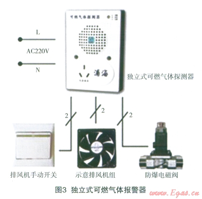 單一報警功能的報警器:它能在傳感器周圍燃?xì)鉂舛冗_到一定數(shù)值時嗚叫或者發(fā)光報警,提示家庭用戶及時采取措施。這種報警器的特點是價格較低,安裝簡便,無需改造燃?xì)庀到y(tǒng),因此適用于老舊小區(qū)。另一類為帶信號輸出功能的報警器,如圖3所示。這種報警器可以驅(qū)動電磁閥在報警的同時及時切斷燃?xì)馔ǖ?,或者控制排風(fēng)扇、抽油炯機強制排風(fēng),但其安裝相對復(fù)雜。
