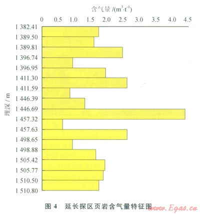 與常規(guī)天然氣類似,要構(gòu)成一定的儲(chǔ)量規(guī)模,頁巖氣必須具備充足的氣源條件,但這并不意味著其氣源條件狹窄,對(duì)地質(zhì)、地球化學(xué)等指標(biāo)仍有定量上的要求。在頁巖規(guī)模確定的前提下,含氣量的大小是決定探區(qū)是否具有商業(yè)開采價(jià)值的關(guān)鍵。含氣量的大小一方面受控于儲(chǔ)集空間的發(fā)育程度,另一方面受控于烴源巖的生氣能力,而最終決定頁巖生氣能力的是有機(jī)質(zhì)的豐度、類型和成熟度。有機(jī)質(zhì)的豐度、類型和成熟度在一定程度上具有生氣互補(bǔ)性,例如腐泥型母質(zhì)在熱演化程度較低時(shí)也可以生氣,而腐殖型母質(zhì)在高演化程度下才可能生成同等的氣量[3]。同理,含氣量的大小是各種地球化學(xué)參數(shù)指標(biāo)綜合作用的結(jié)果。延長探區(qū)內(nèi)1井與2井具有相同的母質(zhì)類型(以混合型為主),但l井的有機(jī)碳含量為2.2%,鏡質(zhì)體反射率為0.88%,孔隙度為0.25%;而2井的有機(jī)碳含量為3.9%,鏡質(zhì)體反射率為1.0l%,孔隙度為0.11%,孔隙度極小。然而,2口井頁巖的含氣量卻大致相當(dāng)(均接近3.5m3/t)。由此可見,地球化學(xué)指標(biāo)上的差異并不代表頁巖整體含氣性的差異,當(dāng)某個(gè)地球化學(xué)指標(biāo)條件差時(shí),若其他指標(biāo)較好仍可能具有可觀的含氣量。因此,在進(jìn)行頁巖氣地質(zhì)評(píng)價(jià)時(shí),不能采用單一的地球化學(xué)指標(biāo)來進(jìn)行判別。