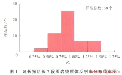 延長探區(qū)長7段頁巖埋深變化大(500~1800m)、構(gòu)造演化歷史和熱作用歷史存在差異,其現(xiàn)今的熱成熟度變化亦較大。長7段頁巖的鏡質(zhì)體反射率變化范圍為0.25%~l.50%,基本上涵蓋了生物作用生甲烷氣、熱降解作用生油氣和高溫?zé)崃呀馍鷼?span lang="EN-US">3個(gè)生烴階段,但以熱降解作用階段為主(圖1)。因此,從成因類型上看,長7段頁巖氣包括生物作用成因、熱降解成因和高溫?zé)崃呀獬梢?span lang="EN-US">3種類型。
