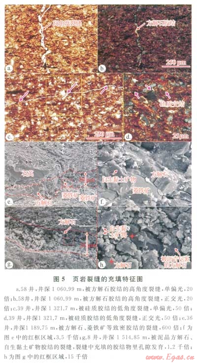頁巖不但是頁巖氣的烴源巖和儲(chǔ)層,超低的孔滲性還使得頁巖可成為頁巖氣的蓋層[13-14]。但這并非表明頁巖氣的賦存對(duì)蓋層條件沒有嚴(yán)格要求。在孔滲條件較優(yōu)越地區(qū),蓋層條件可能是需要上覆蓋層。例如美國的Barnett頁巖其上覆“蓋層”為石灰?guī)r[10]。對(duì)于孑L滲條件差但裂縫發(fā)育的地區(qū),蓋層條件則是裂縫需要被充填。以長7段頁巖為例,部分頁巖裂縫極其發(fā)育,但裂縫并沒有破壞其含氣性,原因在于一些裂縫被高度充填,阻止了氣體的二次運(yùn)移。長7段頁巖的裂縫膠結(jié)物包括方解石膠結(jié)物(正交光下顯示高級(jí)干涉色,圖5-a、5-b)和硅質(zhì)膠結(jié)物(正交光下顯示一級(jí)灰干涉色,圖5-c、5-d)。被嵌晶連晶方解石或硅質(zhì)膠結(jié)物充填的裂縫較致密、結(jié)晶較大、晶形完整,膠結(jié)礦物主要為碳酸鹽類,以方解石為主,局部見菱鐵礦,可見自生黏土礦物充填晶間縫(圖5-e、5-f)。被泥晶方解石和黏土礦物充填的裂縫較疏松,膠結(jié)物中發(fā)育晶間孔孔隙,泥晶方解石膠結(jié)物大小介于5~10mm,自生黏土礦物晶體大小介于l~2mm(圖5-g、5-h)。