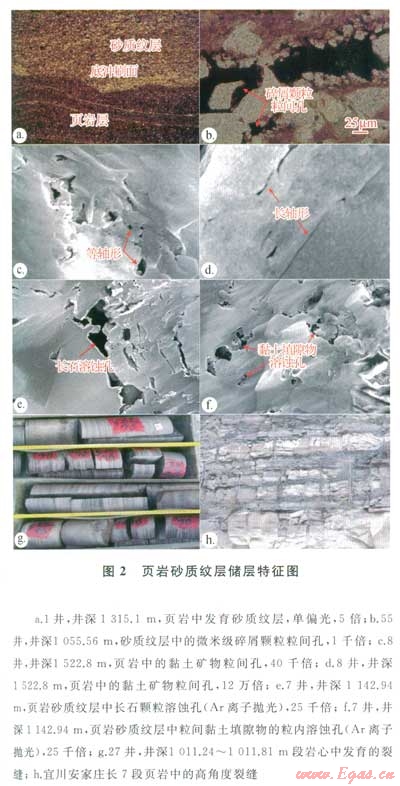 砂質(zhì)紋層廣泛發(fā)育原生粒間孔和次生溶蝕孔。原生粒間孔主要是碎屑顆粒粒間孔與黏土礦物粒間孔。碎屑顆粒粒間孔在砂質(zhì)紋層中極為常見,該類孔隙的孔隙形態(tài)多呈不規(guī)則的多邊形,直徑以微米級(jí)至幾十微米為主(大孔級(jí))(圖2-a、2-b)。黏土礦物粒間孔是黏土礦物(主要是伊利石與綠泥石)圄成的孔隙空間,掃描電鏡下常見長軸形和等軸形2種形態(tài)(圖2-c、2-d)。長軸形由于壓實(shí)的影響而呈“縫”狀,其孔徑大小可達(dá)數(shù)十納米(中孔級(jí)),一般沿黏土礦物層理呈定向分布;等軸形是黏土礦物顆粒在強(qiáng)水動(dòng)力環(huán)境堆積而成的粒間孔,或者是黏土絮凝物在靜水環(huán)境殘留下來的殘余孔(一般為大孔級(jí)),分布較雜亂。次生溶蝕孔一般發(fā)育在長石及碎屑顆粒的粒間填隙物內(nèi)(圖2-c、2-f),包括粒間孔、粒內(nèi)孔和鑄??祝粤ig孔為主。粒間孔形態(tài)各異,常見港灣狀溶蝕邊緣,直徑以數(shù)十至數(shù)百納米為主(中孔級(jí));粒內(nèi)孔多納米級(jí)(小孔級(jí));鑄??装w粒間易溶物鑄模和顆粒鑄模,孔徑變化較大。砂質(zhì)紋層還發(fā)育構(gòu)造裂縫,裂縫面比較粗糙,以高角度縫為主,產(chǎn)狀不穩(wěn)定(圖2-g、2-h)。