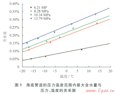2)雜質(zhì)的存在會(huì)對(duì)CO2輸送管道的安全運(yùn)行產(chǎn)生極大的影響,特別是游離水的出現(xiàn)。當(dāng)輸送過程中含水量超過水的溶解度極限時(shí),管內(nèi)會(huì)析出游離水,游離水的出現(xiàn)會(huì)對(duì)CO2輸送管道的設(shè)計(jì)操作、腐蝕及CO2水合物生成產(chǎn)生負(fù)面影響,因此,需要設(shè)定CO2輸送管道最大允許含水量的規(guī)范。