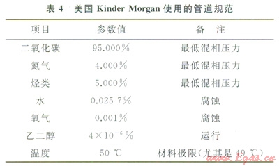 日前運(yùn)行的管道中所輸送的CO2混合物及對(duì)純度和含水量的規(guī)定等都不盡相同。國際上對(duì)于管道系統(tǒng)輸送CO2混合氣體的組成要求沒有統(tǒng)一的標(biāo)準(zhǔn)?;旌蠚怏w的組成要求很大程度上取決于設(shè)計(jì)階段進(jìn)行的評(píng)估,包括流動(dòng)安全、管道完整性、安全性及終端用戶對(duì)CO2純度的需求。美國Kinder Morgan使用的管道規(guī)范見表4[12]。