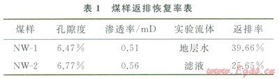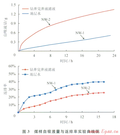 煤巖具有高毛細(xì)管壓力特征,鉆井完井液濾液與煤層接觸后在毛細(xì)管力的作用下將發(fā)生毛細(xì)管自吸,使煤層含水飽和度增加,氣相滲透率降低,并導(dǎo)致后期排采作業(yè)中鉆井完井液濾液長(zhǎng)時(shí)間難以完全返排。為了掌握煤巖對(duì)鉆井完井液濾液的毛細(xì)管自吸特征,開展了相同滲透率級(jí)別煤樣的地層水和鉆井完井液濾液毛細(xì)管自吸實(shí)驗(yàn)和模擬排采過程的氣驅(qū)水返排實(shí)驗(yàn)[14]。實(shí)驗(yàn)結(jié)果(圖3)表明,自吸曲線初始階段白吸速率很快,液相在毛細(xì)管力作用下迅速自吸進(jìn)入裂隙和大孔中,隨著時(shí)間的增長(zhǎng)白吸速率逐漸下降,液相以擴(kuò)散吸附的方式進(jìn)入微孔,相同時(shí)間內(nèi)鉆井完井液濾液的白吸量高于地層水的自吸量。通過氣相返排實(shí)驗(yàn)結(jié)果(圖3和表l)可以看出滲透率級(jí)別相近條件下地層水的返排率明顯高于鉆井完井液濾液的返排率,表明鉆井完井液濾液的吸附滯留將嚴(yán)重影響煤樣的返排能力,導(dǎo)致氣相滲透率的顯著降低。