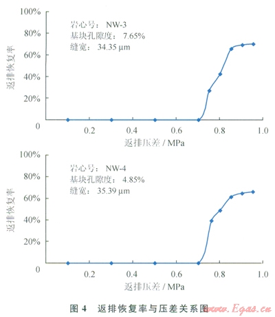 考慮原地條件下鉆井完井液損害評(píng)價(jià),結(jié)果更真實(shí)地反映煤層的損害程度[15-16]。筆者采用滲透率恢復(fù)實(shí)驗(yàn)評(píng)價(jià)鉆井完井液對(duì)煤樣滲流能力的影響,評(píng)價(jià)時(shí)將巖心被鉆井完井液動(dòng)態(tài)循環(huán)反向損害后正向測(cè)得的滲透率與損害前正向測(cè)得的巖心滲透率進(jìn)行對(duì)比,得到的比值稱為滲透率返排恢復(fù)率。返排恢復(fù)率越高,表明鉆井完井液對(duì)煤層滲流通道的損害越弱。實(shí)驗(yàn)結(jié)果見圖4,兩塊滲透率級(jí)別相近煤樣都在較小壓差下就能突破濾餅,隨著壓差的不斷增大,煤樣的滲透率返排恢復(fù)率可達(dá)70%,表明鉆井完井液固相引起的滲透率降低程度較弱。