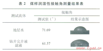 煤巖具有較大的表面積,使其具有較高的吸附各種流體及氣體的能力。鉆井完井液濾液中包含一些表面活性劑,當(dāng)鉆井完井液濾液侵入煤層后,將在煤巖表面吸附進(jìn)而改變煤巖的潤(rùn)濕性。運(yùn)用接觸角測(cè)量?jī)x對(duì)地層水與鉆井完井液濾液在煤巖表面的潤(rùn)濕角進(jìn)行了測(cè)量(表2),可見地層水的潤(rùn)濕角大于鉆井完井液的潤(rùn)濕角,亦就是鉆井完井液在煤巖表面的潤(rùn)濕性強(qiáng)于地層水,導(dǎo)致鉆井完井液更容易吸附于煤巖表面。