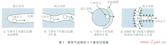 煤層氣的產(chǎn)出可以概括為3個(gè)過程:①從吸附態(tài)轉(zhuǎn)變?yōu)橛坞x態(tài)的解吸過程;②在濃度差、壓力差作用下氣體分子的擴(kuò)散過程;③擴(kuò)散氣體在煤巖儲(chǔ)層的裂縫系統(tǒng)滲流并最終流入井筒的過程。煤層氣的產(chǎn)出受解吸—擴(kuò)散—滲流過程的共同控制,3個(gè)環(huán)節(jié)緊密相連,相互影響,相互制約,任一過程受制,都將嚴(yán)重影響煤層甲烷的產(chǎn)出。筆者結(jié)合鉆井完井液作用對(duì)煤層氣運(yùn)移行為的影響,將煤層氣產(chǎn)出過程劃分為4個(gè)基本過程(圖1):①氣體分子從煤巖孔隙表面解吸;②氣體分子在煤巖孔隙中擴(kuò)散;③氣體分子在界面液膜內(nèi)擴(kuò)散;④基塊擴(kuò)散氣體進(jìn)入裂縫系統(tǒng)滲流并最終流入井筒。由此可見,鉆井完井液與煤層相互接觸后固相和液相的侵入,不僅降低裂縫的滲流能力,而且亦會(huì)引起煤巖表面的物理化學(xué)作用導(dǎo)致煤層氣的解吸—擴(kuò)散能力的下降,從而影響煤層氣運(yùn)移的全過程。