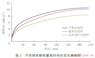 鉆井完井液濾液是一種化學(xué)成分比較復(fù)雜的流體,包含各種表面活性劑,煤層氣井鉆井過程中鉆井完井液濾液侵入后將與煤層發(fā)生物理化學(xué)作用,降低煤巖解吸能力進(jìn)而影響煤層氣產(chǎn)量,為考察現(xiàn)場(chǎng)用鉆井完井液體系對(duì)寧武盆地9號(hào)煤層解吸能力的影響,開展了平衡水煤樣、飽和水煤樣和鉆井完井液處理煤樣的解吸實(shí)驗(yàn)。