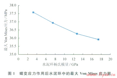 在以往關(guān)于蠕變地應(yīng)力對(duì)封固系統(tǒng)受力狀態(tài)影響的研究中,建立的封固系統(tǒng)模型通常包括套管、水泥環(huán)和地層3個(gè)部分,將蠕變地應(yīng)力施加于地層外側(cè)[19-20]。工程實(shí)際中,蠕變地應(yīng)力最終直接作用于水泥環(huán)上[15],與上述建立的模型有所差別。本研究根據(jù)工程實(shí)際情況,建立的封固系統(tǒng)模型只包括套管和水泥環(huán)兩部分,將蠕變地應(yīng)力直接施加于水泥環(huán)外側(cè)。井眼直徑取為215.9mm,套管內(nèi)外徑分別取為l57.1mm和177.8mm,套管楊氏模量及泊松比分別取為210GPa和0.26,水泥環(huán)泊松比取為0.19,變化水泥環(huán)楊氏模量分別為3.32GPa(水泥漿密囊1.57g/cm3,無(wú)圍壓,抗壓強(qiáng)度16.4MPa)、7.49GPa(水泥漿密度1.79g/cm3,無(wú)圍壓,抗壓強(qiáng)度21.2MPa)、l2.73GPa(水泥漿密度1.85g/cm3,圍壓5MPa,抗壓強(qiáng)度27.1MPa)、17.45GPa(水泥漿密度1.9g/cm3,圍壓20MPa,抗壓強(qiáng)度34.3MPa)。一界面和二界面處的初始擠壓應(yīng)力分別設(shè)為2MPa和3MPa,蠕變地應(yīng)力取為40MPa。利用ANSYS軟件建模和計(jì)算封同系統(tǒng)中的應(yīng)力,選擇Von Mises準(zhǔn)則汁算得到水泥環(huán)中的最大應(yīng)力(位于水泥環(huán)內(nèi)側(cè))(圖1)。