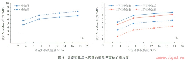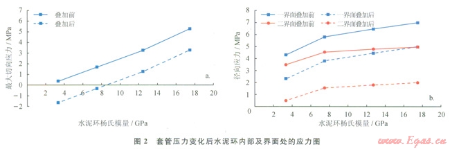 由圖4-a圖看出,水泥環(huán)內(nèi)的最大Von Miscs應(yīng)力隨水泥環(huán)楊氏模量的增大而增大;與初始應(yīng)力替加后,Von Mises應(yīng)力增大為4.4~8.0MPa,小于普通水泥環(huán)的屈服強(qiáng)度。所以,當(dāng)溫度變化幅度不大時(shí),水泥環(huán)通常不會(huì)發(fā)生屈服破壞,但溫度升高幅度較大時(shí)水泥環(huán)可能會(huì)發(fā)生屈服破壞。因此,對(duì)熱采井等應(yīng)避免使用膨脹水泥漿,且應(yīng)使用低楊氏模量的水泥環(huán)。由圖4-b可以看出,與初始應(yīng)力疊加前,一、二界面在徑向上受拉伸應(yīng)力的作用且應(yīng)力隨水泥環(huán)的楊氏模量增大而增大,為4.4~8.0MPa,遠(yuǎn)大于一、二界面膠結(jié)的抗拉強(qiáng)度,會(huì)破壞一、二界面膠結(jié);與初始應(yīng)力疊加后,徑向應(yīng)力顯著降低至1.4~6.0MPa,降低了一、二界面膠結(jié)破壞的風(fēng)險(xiǎn)。因此,通過(guò)降低水泥環(huán)楊氏模量和增大初始應(yīng)力都可以降低界面膠結(jié)破壞的風(fēng)險(xiǎn),建議采用較低楊氏模量的水泥環(huán)或使用膨脹水泥來(lái)預(yù)防失效。
