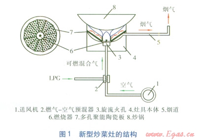 新型炒菜灶主要工作原理為:空氣通過送風(fēng)機(jī)經(jīng)空氣管道進(jìn)入燃?xì)?/span>—空氣預(yù)混器,LPG通過開設(shè)在預(yù)混器側(cè)壁上的小孔高速噴入與空氣初步混合。LPG與空氣再經(jīng)旋流火孔噴出后進(jìn)一步混合,使得可燃混合氣成一定角度旋流強(qiáng)烈燃燒,使得鍋底與火焰的接觸面積增大。高溫?zé)煔馔ㄟ^多孔聚能陶瓷板上的環(huán)形孔后排入煙道,陶瓷板積蓄了大量的煙氣余熱,可對(duì)鍋底進(jìn)行二次輻射加熱,實(shí)現(xiàn)了高溫?zé)煔獾挠酂峄厥绽谩?/span>