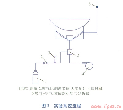 新型炒菜灶與傳統(tǒng)炒菜灶的實(shí)驗(yàn)系統(tǒng)基本一致。實(shí)驗(yàn)裝置包括LPG鋼瓶、煙氣分析儀、燃?xì)獗壤{(diào)節(jié)閥、流量計(jì)、電子溫度計(jì)等。煙氣分析儀用于測(cè)量煙氣中CO體積分?jǐn)?shù),燃?xì)獗壤{(diào)節(jié)閥用于調(diào)節(jié)控制LPG的流量,流量計(jì)用于計(jì)量LPG累計(jì)流量。實(shí)驗(yàn)系統(tǒng)流程見圖3。