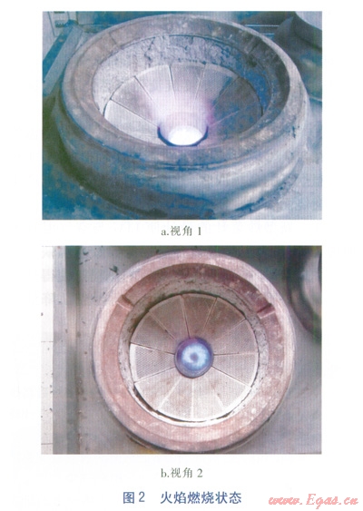新型炒菜灶的結(jié)構(gòu)見圖1,火焰燃燒狀態(tài)見圖2。主要由燃?xì)庖豢諝忸A(yù)混器、灶具本體、燃燒器、扇形多孔聚能陶瓷板、送風(fēng)機(jī)等組成。燃燒器的內(nèi)壁開有能使可燃混合氣旋流噴出的旋流火孔,方向?yàn)檩S向順時(shí)針傾斜15°并且切向傾斜向上15°,孔徑為2.5mm。