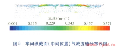 車間縱截面(中間位置)氣流流速分布云圖見圖5。由圖5可知,車間室內(nèi)主要工作區(qū)氣流流速為0.50~0.55m/s,相對于推薦值略高。