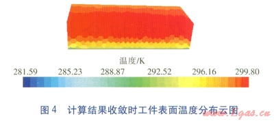 計(jì)算結(jié)果收斂時(shí)工件表面溫度分布云圖見圖4。由圖4可知,計(jì)算結(jié)果收斂時(shí)工件表面溫度在24~25℃,溫度分布均勻,但在工件底部出現(xiàn)了明顯的溫度梯度。筆者認(rèn)為是工件底部與地面接觸處,受輻射角系數(shù)的影響產(chǎn)生了溫度梯度。由模擬結(jié)果可知,工件表面平均溫度呈先升高后下降的趨勢。模擬開始時(shí),以輻射板對固體工件表面的輻射作用為主,因此工件表面溫度迅速升高,達(dá)到一定溫度時(shí),工件開始與周圍氣流發(fā)生對流換熱,溫度有所下降,直至計(jì)算結(jié)果收斂時(shí),保持在24~25℃。