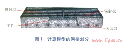 采用機(jī)械送風(fēng)(未經(jīng)處理的室外空氣)與頂面熱水輻射供暖相結(jié)合的方式,送排風(fēng)口各8個(gè),分別布置在車間兩側(cè)80m長的墻上,一側(cè)為送風(fēng)口,另一側(cè)為排風(fēng)口,距離地面3.5m,尺寸均為115cm×115cm。換氣次數(shù)為5次/h,機(jī)械通風(fēng)速度1m/s。