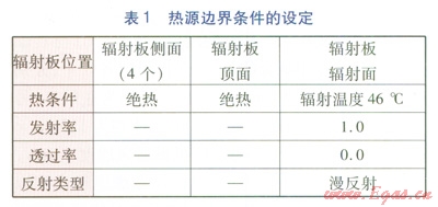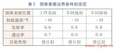 采用S2S(Surface-to-Surface)輻射換熱模型,忽略車間內(nèi)空氣對輻射板輻射能的吸收,模擬輻射板對車間內(nèi)工件、地面、墻面的熱輻射過程,以及車間內(nèi)主要的流固耦合過程。以基爾霍夫定律為基礎(chǔ),由STAR-CCM+軟件可直接計(jì)算各表面的反射率,從而進(jìn)行輻射換熱量計(jì)算。熱源(即輻射板)與各固體表面邊界條件的設(shè)定見表1、2。