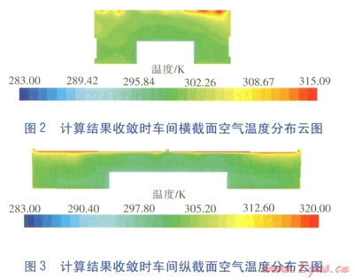 由于噴涂車間的溫度與氣流組織分布主要體現(xiàn)在車間內(nèi)部的流體區(qū)域,因此在模擬計(jì)算前對模型進(jìn)行抽取內(nèi)部流體空間處理。計(jì)算結(jié)果收斂時(shí)車間橫截面(中間位置)、縱截面(中間位置)的空氣溫度分布云圖分別見圖2、3。由圖2、3可知,車間室內(nèi)空氣溫度范圍為25~27℃,接近熱源處溫度較高(在36℃左右)。沿高度方向溫度梯度較小,溫度分布均勻,符合輻射供暖的特點(diǎn)。
