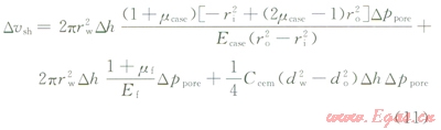 根據(jù)模型假設(shè)④套管、水泥漿、地層緊密相連無間隙,且結(jié)合假設(shè)①忽略熱膨脹效應(yīng)可得,水泥漿總體積變化量應(yīng)等于套管和井壁圍巖體積恢復(fù)膨脹量,即