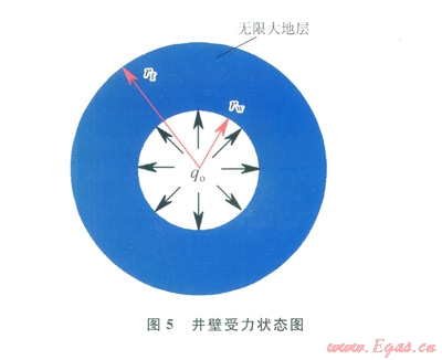 “地層 井眼”模型如圖5。地層可看作是半徑無窮大的圓,由圣維南原理[22]可知:無窮大地層半徑遠(yuǎn)大于井眼半徑,因此由井壁應(yīng)力對無窮遠(yuǎn)處的總應(yīng)力擾動是很小的,可以不計。由于水泥漿未凝固,故井壁僅受水泥漿液柱壓力(qo)的內(nèi)壓作用。