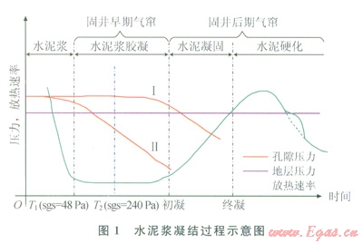 隨著水化反應(yīng)的進行,液態(tài)水泥漿逐漸凝固成固態(tài)水泥石需經(jīng)歷液相、膠凝、凝固和硬化等4個階段[15](圖1)。液態(tài)水泥漿能夠完全傳遞孔隙壓力,不會發(fā)生氣竄;膠凝態(tài)水泥漿不斷形成膠凝結(jié)構(gòu),發(fā)生塑性體積收縮,引起孔隙壓力逐漸降低;初凝后,水泥漿進入凝固、硬化階段,表現(xiàn)出固態(tài)特征,滲透率極低,能有效阻止水泥環(huán)本體氣竄[16-17]。南上述研究分析可知,固井早期氣竄包括兩個階段:靜膠凝強度過渡時間(T1至T2);靜膠凝強度過渡時間結(jié)束時刻至初凝(T2至初凝)。