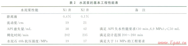 已知X區(qū)塊兩口天然氣井Xl和X2。XJ井:Æ177.8mm(內(nèi)徑157.1mm)油層尾管下深5085m,井眼直徑215.9mm,鉆井液密度為2.30g/cm3,采用高密度(2.35g/cm3)水泥漿固井,水固比0.263,封固井段4400~5085m,水泥漿實驗設(shè)計溫度為110℃;X2井:Æ127mm油層尾管懸掛固井,井眼直徑149.2mm,鉆井液密度為2.10g/cm3,采用密度為2.13g/cm3水泥漿固井,水固比0.364,封固井段4862~5731m,水泥漿實驗設(shè)計溫度為120℃。已知該區(qū)地層壓力梯度為0.0225MPa/m,油層套管彈性模量為206.9GPa、泊松比0.3,地層巖石彈性模量為13.84GPa、泊松比0.287。X1、X2兩井水泥漿基本工程性能滿足現(xiàn)場施工要求(表2)。