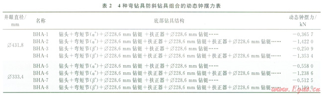 塔里木山前高陡構(gòu)造井斜控制[7]是空氣鉆井難題之一,空氣錘防斜技術(shù)[8]難以奏效,基于鉆具動(dòng)力學(xué)特性分析,提出一種“彎鉆具動(dòng)力學(xué)防斜技術(shù)”[9-10],對(duì)4種不同鉆具組合的動(dòng)態(tài)鐘擺力進(jìn)行了分析,優(yōu)選出Æ431.8mm和Æ333.4mm井眼的“彎短節(jié)+雙扶正器”的動(dòng)力學(xué)防斜鉆具組合(表2),其底部鉆具組成為:鉆頭+彎短節(jié)(a°)+Æ228.6mm鉆鋌+扶正器+Æ228.6mm鉆鋌+扶正器+Æ228.6mm鉆鋌……