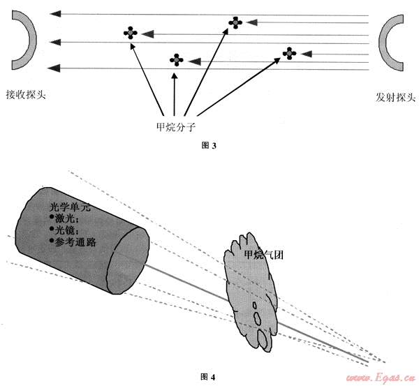 SELMA發(fā)射激光束(1.65μm-近紅外光):激光遇到物體后,漫反射光被光學(xué)單元內(nèi)的拋物柱面鏡所收集,當(dāng)激光遇到甲烷氣團(tuán)。激光的能量被甲烷氣團(tuán)吸收成為甲烷氣團(tuán)的能量組成部分;較少的激光被反射回光學(xué)單元,使接收到的激光信號(hào)減弱;這種減弱會(huì)被專用軟件所處理。利用激光對(duì)甲烷具有極好的選擇性,收集激光在甲烷氣團(tuán)中的散射光,通過軟件的算法,實(shí)現(xiàn)甲烷的濃度峰值的計(jì)算,同時(shí)避免了其它碳?xì)浠衔锏母蓴_。如汽車尾氣等。見圖4。