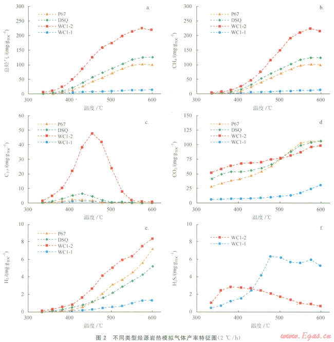 不同類型的烴源巖熱模擬產(chǎn)物中非烴類氣體有CO2、H2S、H2、N2等,且均以CO2為主(圖2-d),并有少量的H。產(chǎn)生(圖2-e),其含量多少與烴源巖所處沉積環(huán)境有著密切關系。其中,CO2和H2的產(chǎn)率隨溫度的升高呈增加的趨勢;H2S則表現(xiàn)為先增加后減少的趨勢。WC1-1樣品的CO2和H2產(chǎn)量在所測試的樣品中產(chǎn)量均最低,但是卻占了其總產(chǎn)氣量的70%以上,說明該類烴源巖以產(chǎn)非烴類氣體為主,產(chǎn)烴類氣的能力有限。WC1-1和WC1-2樣品有少量的H2S氣體產(chǎn)生(圖2-f),說明弧間盆地島弧背景下受火山活動影響,使得烴源巖中硫化物的含量相對于其他沉積環(huán)境明顯增高,而硫化物的存在對于酪根的裂解生烴有催化作用,有利于提高干酪根的熱解生烴產(chǎn)率[12]。這可能是WC1-2樣品具有相對高烴產(chǎn)率的重要原因。
