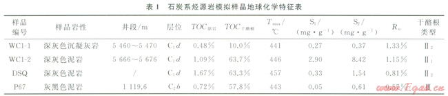 石炭系經(jīng)歷了漫長的地質(zhì)時期,無論是鉆井巖心還是地表露頭,烴源巖的熱演化程度相對較高。為了保證模擬數(shù)據(jù)的準確性和代表性,選取排67井(P67)、烏參1井(WC1-1、WC1-2)和滴水泉露頭剖面(DSQ)成熟度相對較低的樣品進行熱模擬實驗。P67樣品處于殘留洋盆濱淺海相,烴源巖母質(zhì)以陸源高等植物供給為主,干酪根類型為腐殖型(Ⅲ型)。DSQ樣品處于弧后盆地溺湖相沉積環(huán)境,受陸源供給影響較大,干酪根類型以偏腐殖混合型(Ⅱ2型)為主。為了分析火山活動強度對烴源巖品質(zhì)的影響,選取了同為弧間盆地濱淺海相的WC1-1和WC1-2兩個樣品,其中WC1-1樣品形成于火山強烈活動期,受火山活動影響明顯,巖性為深灰色沉凝灰?guī)r,有機碳含量為0.48%,為高等植物和低等水生生物的偏腐殖混合型(Ⅱ2型)干酪根;WC1-2為火山噴發(fā)間歇期正常沉積的深灰色泥巖,有機碳含量為1.09%,有機質(zhì)類型為以低等水生生物主的偏腐泥混合型(Ⅱ2型,見表1)。